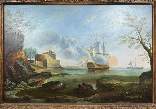 Large Vintage Maritime Oil Painting – Coastal Fort & Sailing Ships