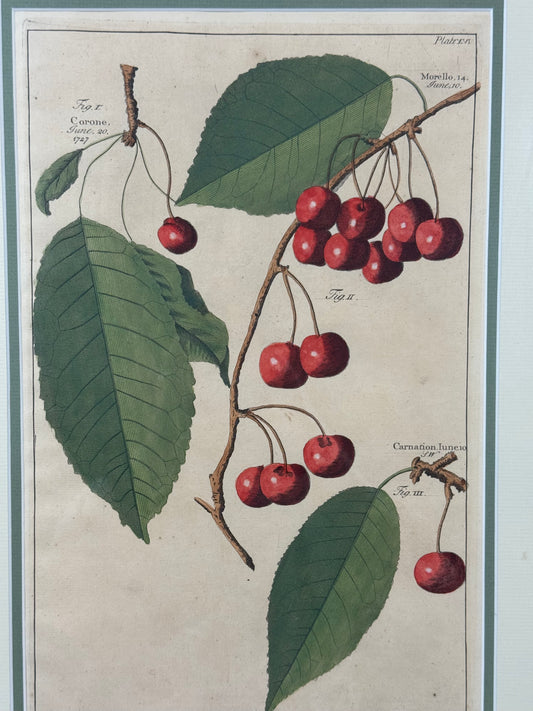 Antique Hand-Colored Engraving – Cherries from Pomona by Batty Langley, 1727