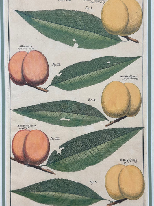 Antique Hand-Colored Engraving – Peaches from Pomona by Batty Langley, 1727