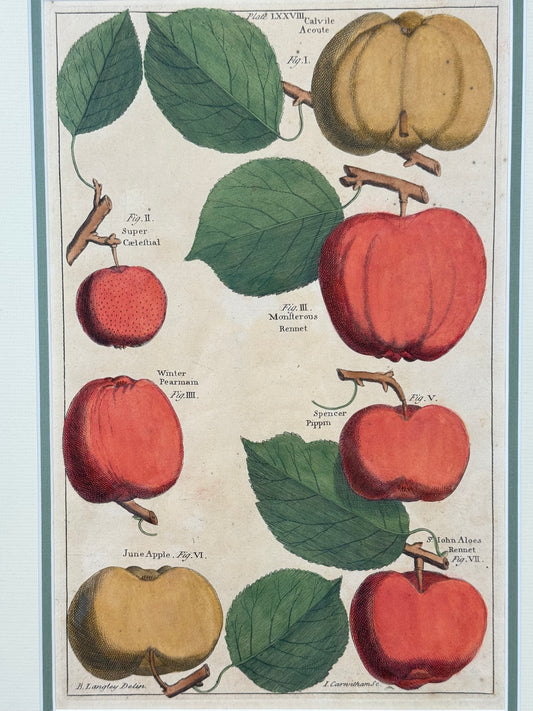 Antique Hand-Colored Engraving – Apples from Pomona by Batty Langley, c. 1729