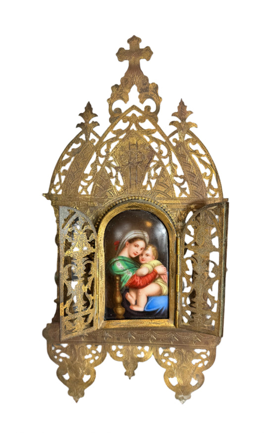 Antique German Gothic Revival Gilt Brass Triptych Shrine with Porcelain Plaque of Madonna and Child