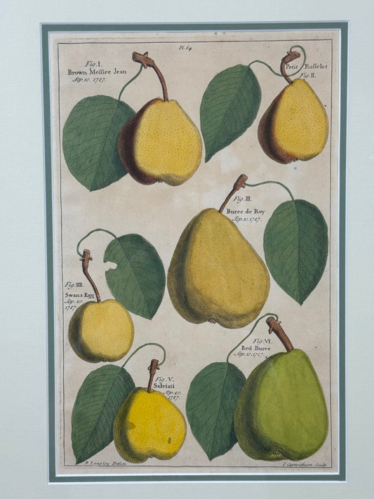 Antique Hand-Colored Engraving – Pears from Pomona by Batty Langley, 1727