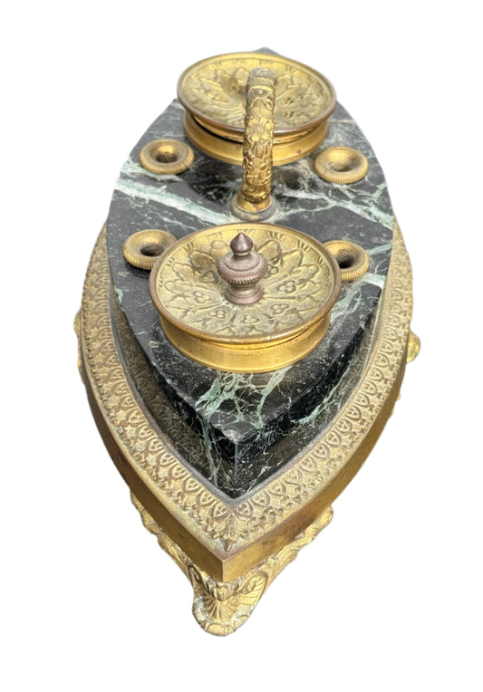 Antique French Empire Revival Green Marble & Gilt Bronze Inkwell, c. Late 19th Century