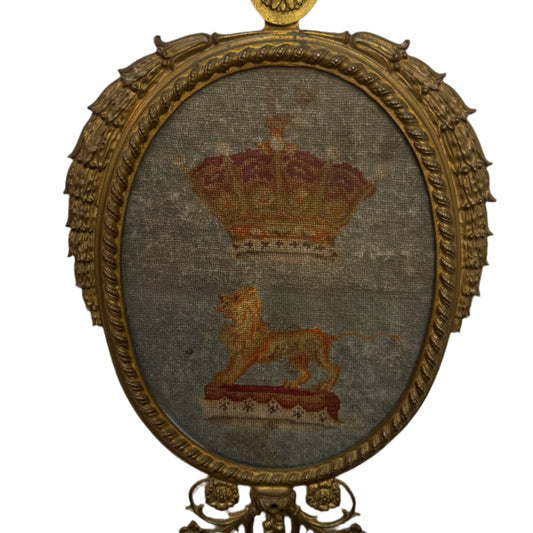 Antique Needlepoint Depicting a Crowned Lion Statant in an Ornate Gilt Bronze Frame